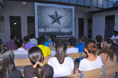 7月15日晚,廣通之家的小院內(nèi)座無虛席,黃陵縣店頭鎮(zhèn)文化站的同志正在為觀眾們播放紅色經(jīng)典電影《地雷戰(zhàn)》和《東進(jìn)序曲》,經(jīng)典的電影片段不時(shí)博得現(xiàn)場觀眾的熱烈掌聲和陣陣歡笑。